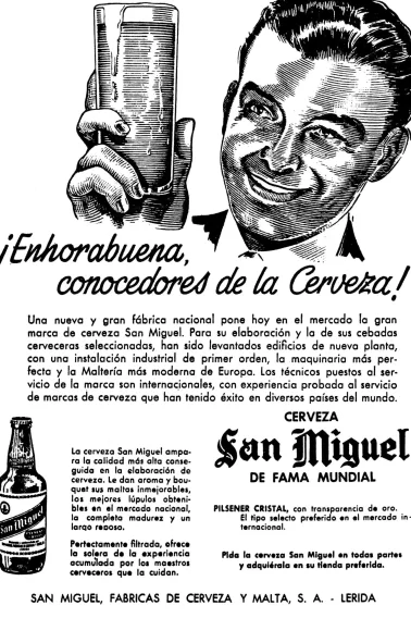 Este anuncio hecho a plumilla, como la publicidad de la época, fue el primero de muchos. Era 1957 y queríamos dar a conocer la apertura de nuestra fábrica de Lérida. Las instalaciones estaban a la cabeza de la modernidad aquellos años. Esta fábrica en la que iniciamos nuestro sueño sigue abierta, aunque se ha ido renovando para seguir ofreciendo la mejor cerveza San Miguel. En el texto además de comunicar nuestra llegada a España, damos la enhorabuena a los que sabían de cerveza porque podrían probar el sabor de San Miguel, que por sus ingredientes y su proceso de elaboración era diferente a todas las demás.